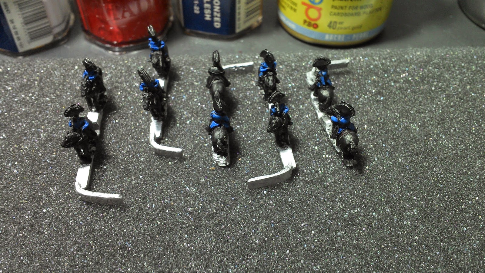 Oui il en reste un dixième qui n’est pas peint… Il est en manteau, tout comme l’un de ceux juchés sur un cheval gris, mais avant de le peindre, je voulais vérifier si je n’avais pas d’image de généraux avec un manteau autre que bleu dans ma documentation. Si je trouve (à part le Maréchal Ney), je le peindrai différemment, sinon il sera bleu aussi.