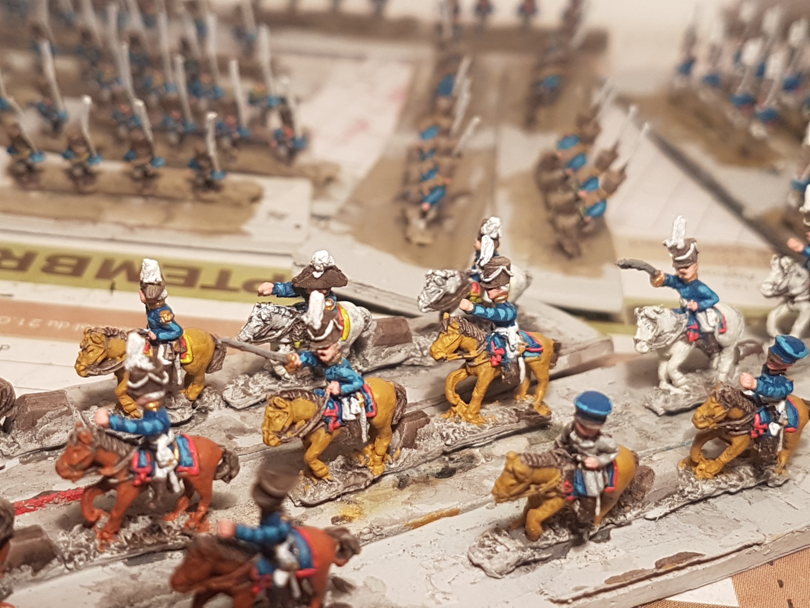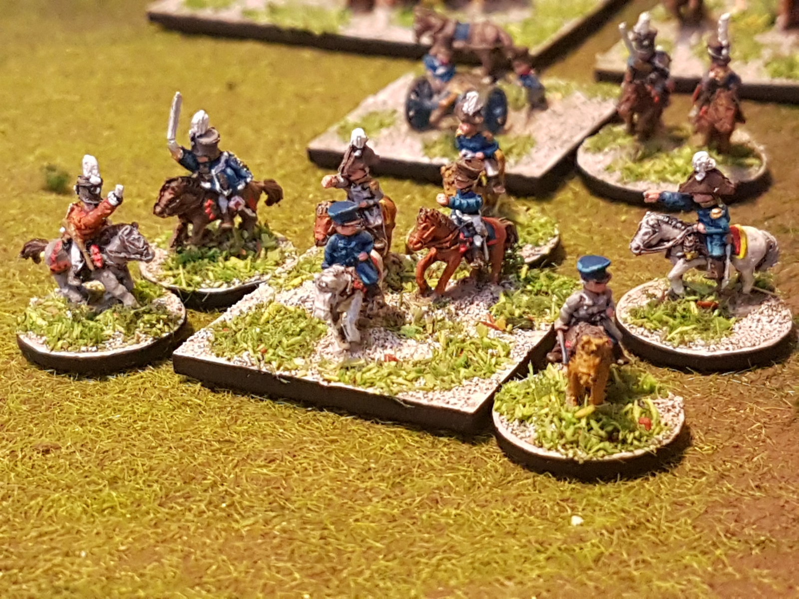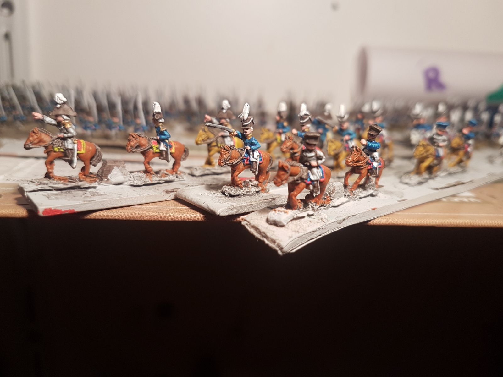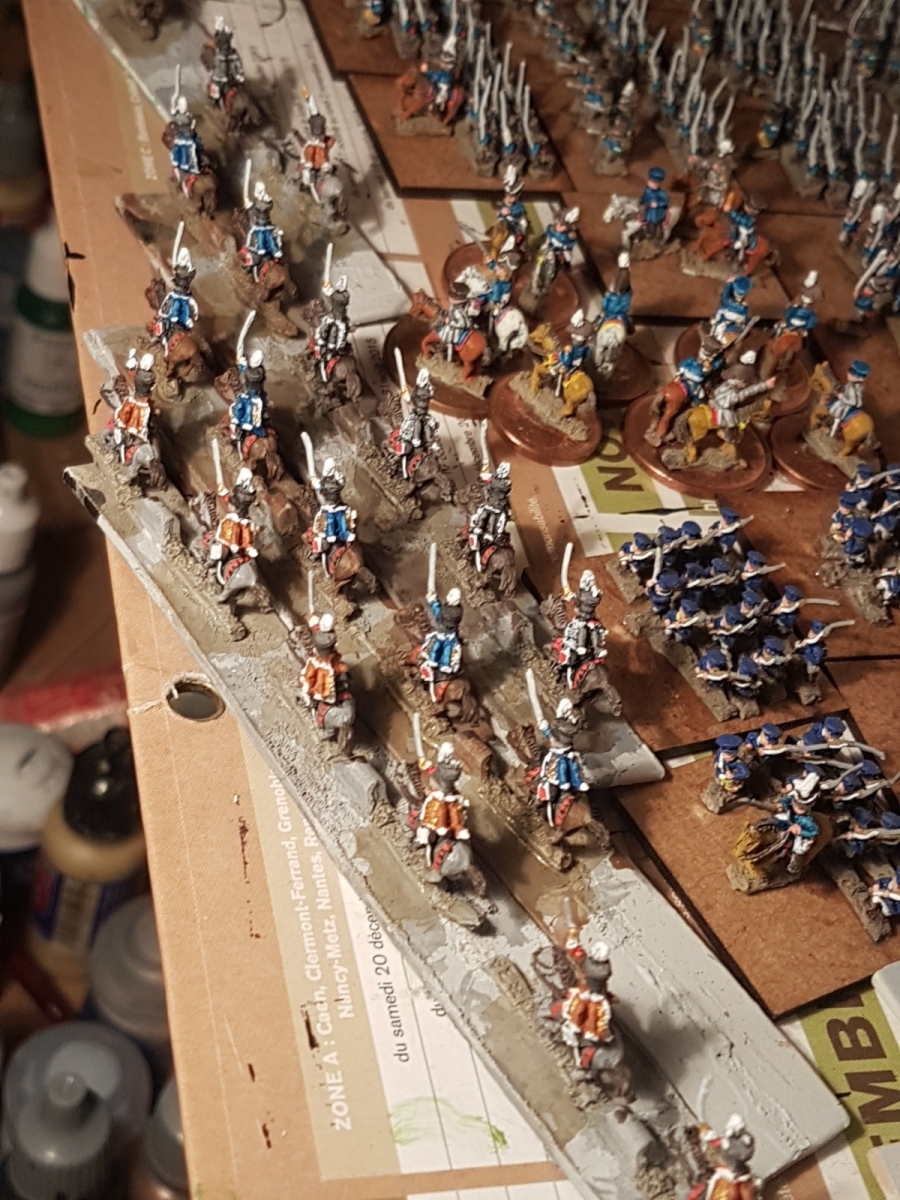 Oui il en reste un dixième qui n’est pas peint… Il est en manteau, tout comme l’un de ceux juchés sur un cheval gris, mais avant de le peindre, je voulais vérifier si je n’avais pas d’image de généraux avec un manteau autre que bleu dans ma documentation. Si je trouve (à part le Maréchal Ney), je le peindrai différemment, sinon il sera bleu aussi.