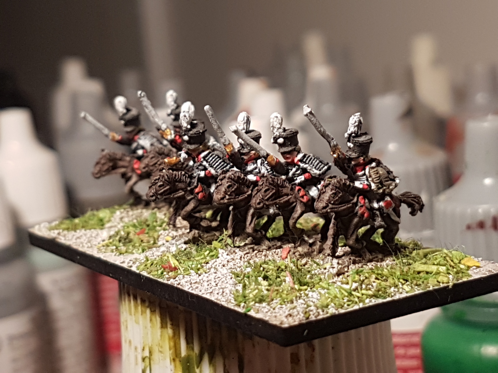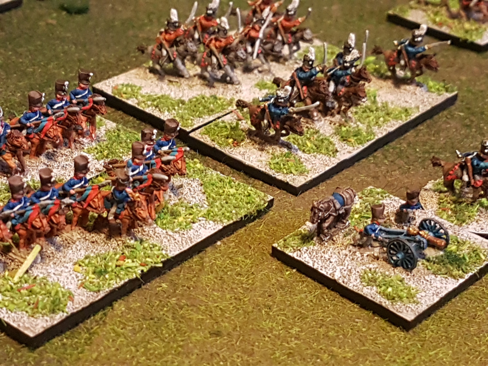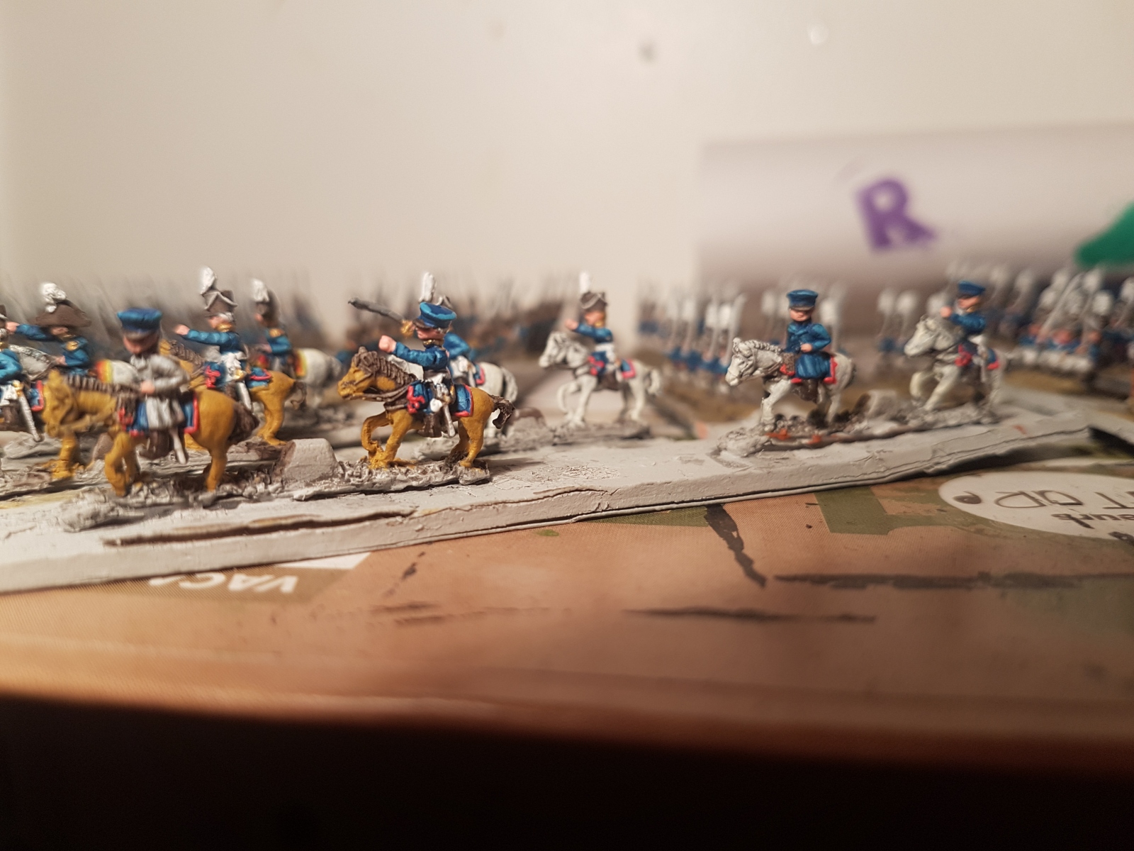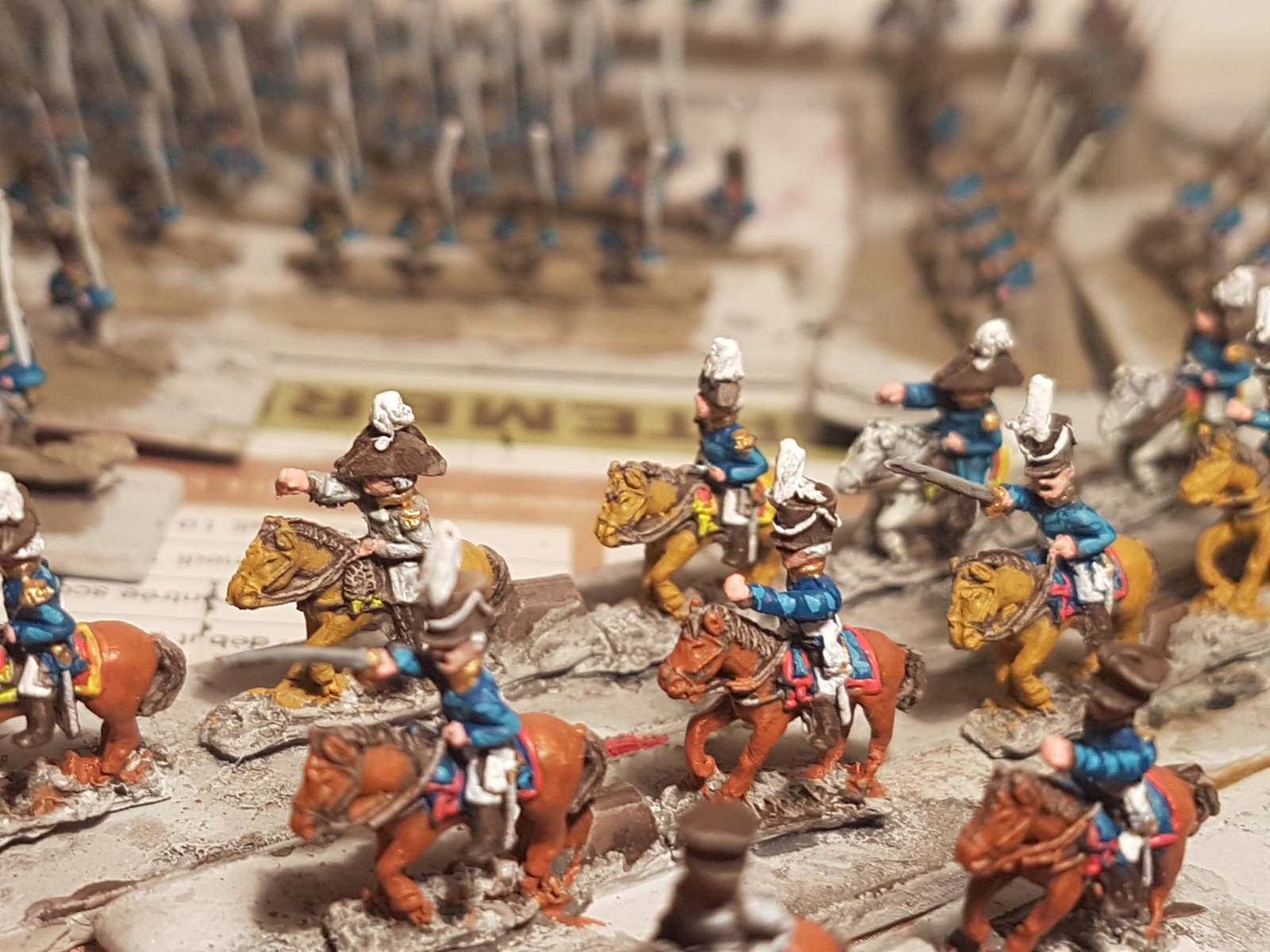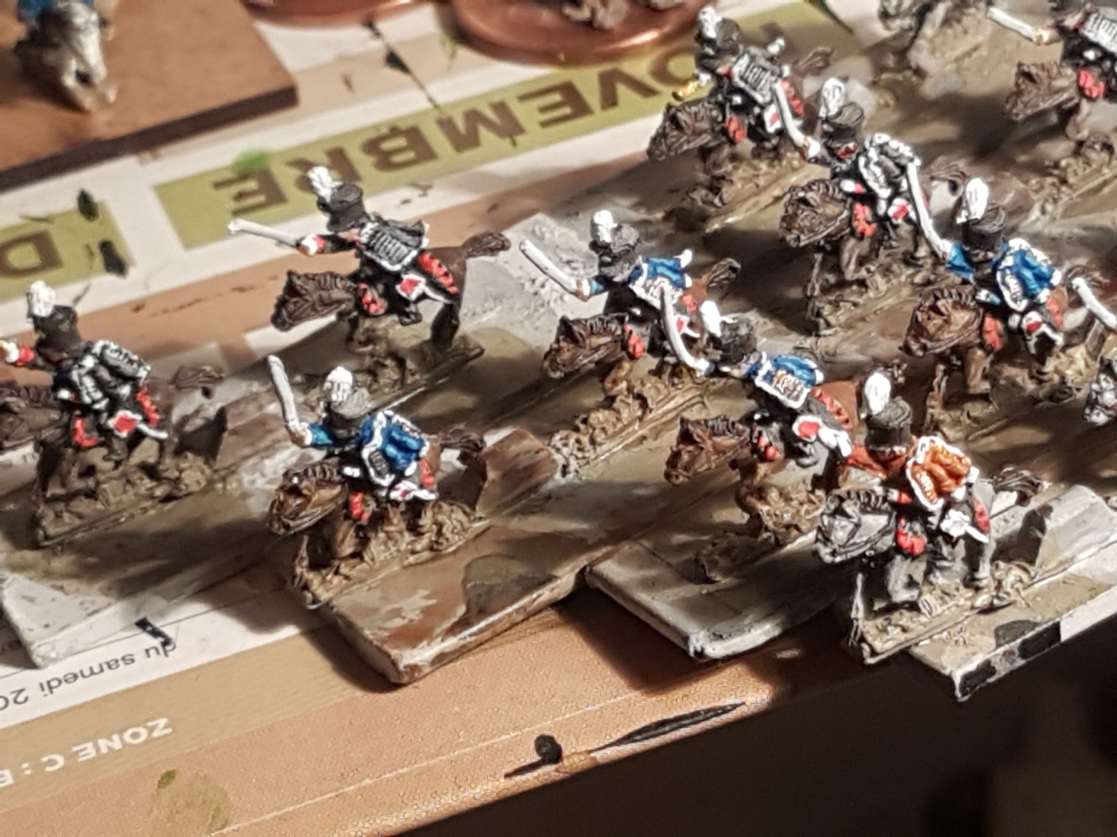 Oui il en reste un dixième qui n’est pas peint… Il est en manteau, tout comme l’un de ceux juchés sur un cheval gris, mais avant de le peindre, je voulais vérifier si je n’avais pas d’image de généraux avec un manteau autre que bleu dans ma documentation. Si je trouve (à part le Maréchal Ney), je le peindrai différemment, sinon il sera bleu aussi.